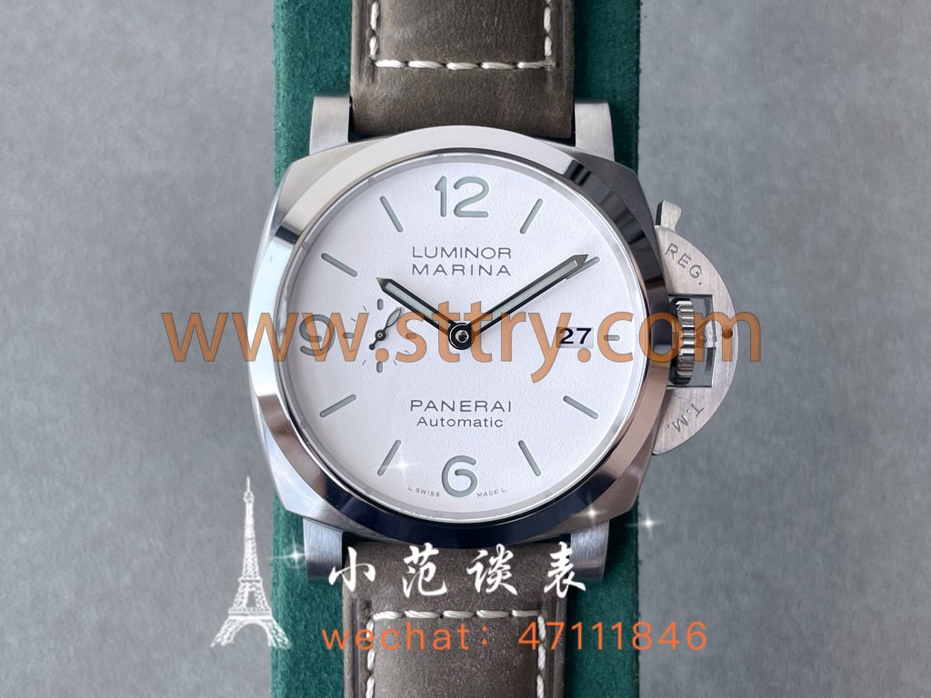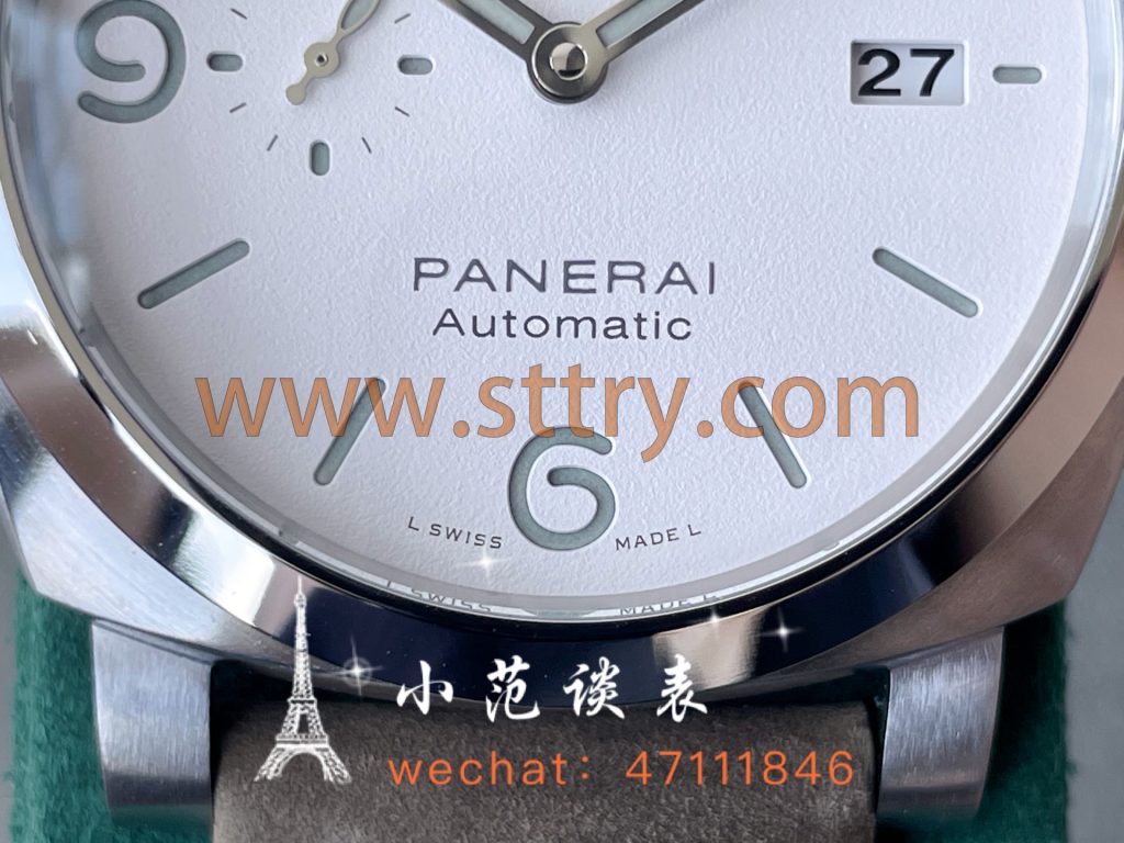 镜面方面腕表则是采用为高通透性的蓝宝石镜面,镜面的通透性也是很强,方便读取腕表的数据,同时蓝宝石在后期佩戴过程中,也不会容易出现刮痕,这也是蓝宝石独有的特性!整体腕表盘面是一个磨砂颗粒质感,给人石灰白的视觉感观。最新版本新款VS厂沛纳海1314修正指针颜色,字体都是有做油性立体感的一个处理,指针和时标均为灰色 。与白色表盘和谐搭配,表盘采用小三针设计,9点钟位置才是小秒盘,日历窗设于3点钟位置,腕表细节方面也是很为到位!
