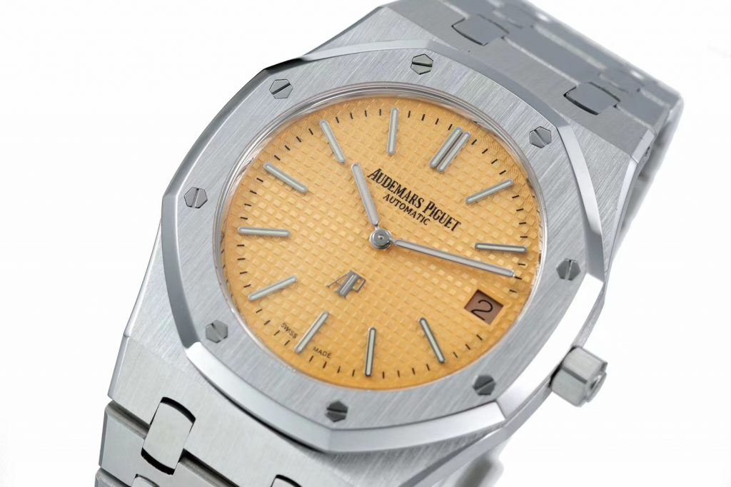 哈喽大家好!我是小范谈表,XF动作频频,对于超薄腕表的研制款式越来越多。今天给各位带来一款全球限量700枚的爱彼15202,白金壳+鲑鱼面,相当少见,因此入手难度不低。据官方数据要想拿下,兜里的预算估计不能低于40万。表径39mm,厚度8mm,非常轻薄,拿来配长袖服装再适合不过了。XF爱彼皇家橡树15202香槟金面对比正品评测